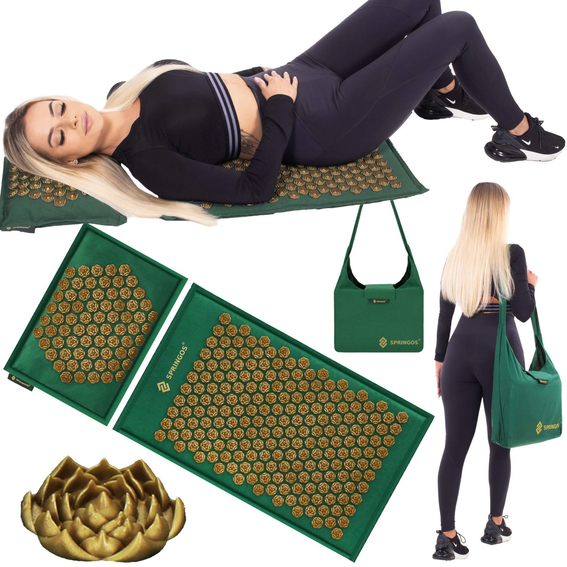 Springos® Akupresszúrás Szőnyeg és Párna szett – Sötétzöld, Arany Tüskékkel ✨ Élvezze a mély relaxációt és a test ellazulását ezzel a prémium minőségű akupresszúrás szőnyeggel és párnás szettel! A 5000 akupresszúrás pont stimulálja a test energiapontjait, segítve a feszültség oldását és a jobb közérzetet. A lótuszvirág alakú tüskék kellemes érzést biztosítanak, miközben hatékonyan masszírozzák a hátat, a nyakat és a vállakat. A szett tartalma: Akupresszúrás szőnyeg (65 x 40 cm) Akupresszúrás párna (40 x 29 cm) Kényelmes hordtáska Anyagok: 100% vászon huzat ABS tüskék Kókuszrost töltelék Jellemzők: Levehető és mosható huzatok (kézi mosás) 5000 akupresszúrás pont a szőnyegen 1750 akupresszúrás pont a párnán Lótuszvirág alakú tüskék Sötétzöld és matt arany színkombináció CE tanúsítvánnyal rendelkezik ✅ Használat: Kezdje a használatot vékony ruházatban, majd fokozatosan növelje a használat idejét, amíg a teste hozzászokik. Az ajánlott használat legalább 5 perc. A szőnyeget fekve, ülve vagy állva is használhatja. Fontos információk: A termék nem orvosi eszköz. Nem ajánlott terhesség, szoptatás, be nem gyógyult sebek, csontritkulás, véralvadásgátlók szedése, vagy a láb/ízületek duzzanata esetén. 16 év alatti gyermekek számára nem ajánlott. Gyermekektől elzárva tartandó! Tárolás: A szőnyeget és a párnát a mellékelt táskában tárolja száraz, szellős helyen.